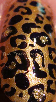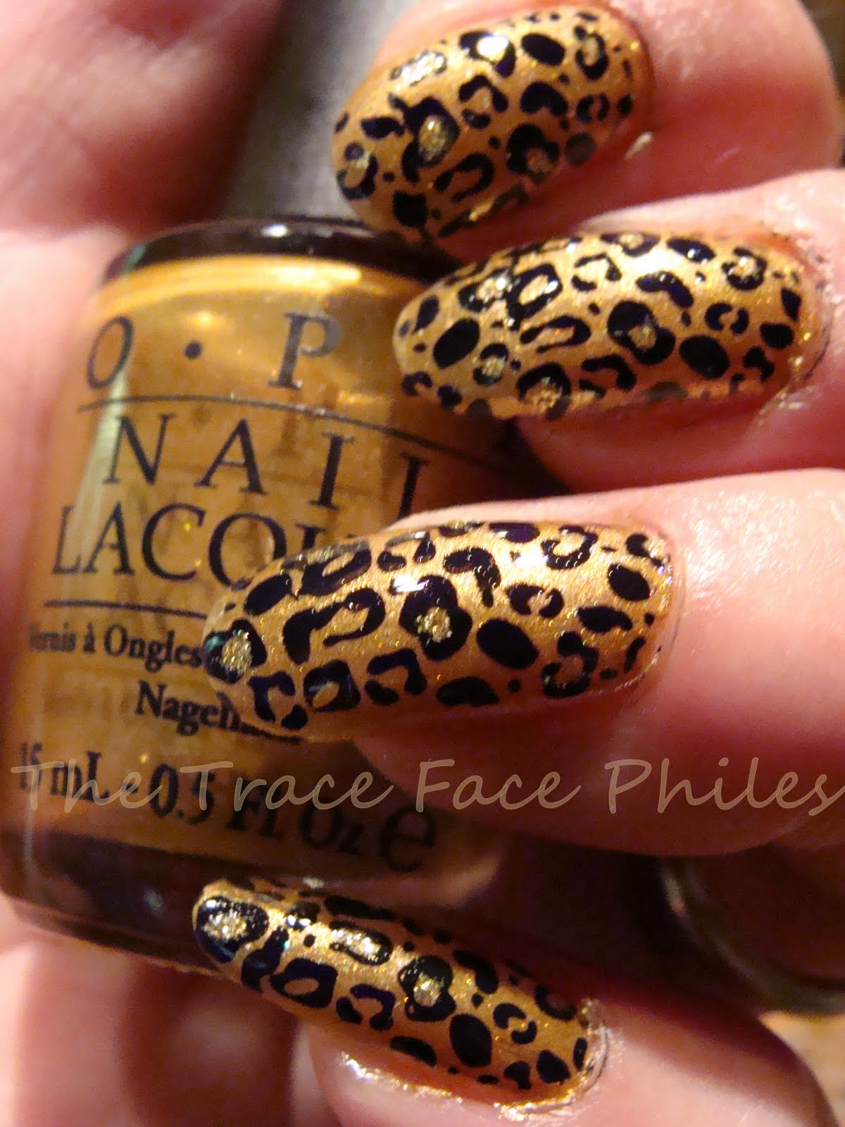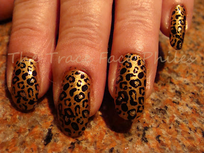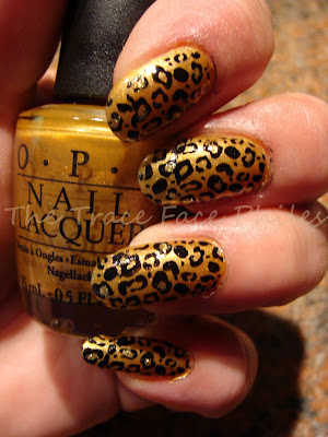 This time she requested a leopard mani that was leopard color. We previously used the Konad leopard stamp, but it was over Zoya Jo. I thought OPI Bling Dynasty was a nice leopardy looking polish. I used 2 coats and Konad Special Polish in Black. I added some gold shimmer in some of the spots. Topped with Seche Vite.