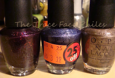 My EPIC find of the weekend.... OPI Merry Midnight!!! I have been wanting this one for a while but refused to pay the prices on ebay. I happened to find it in a gift set with OPI Sapphire in the Snow and a honky silver bracelet for ONLY $8!!!! I was so upset they only had ONE LEFT. ZOMG I couldn't believe it. I am so happy I found it, and for that unbelievable price! I already had Sapphire in the Snow, so it will be a part of my 200 Follower Giveaway! I also found OPI INK Suede and You Don't Know Jacques Suede. These two were also mega-wants of mine. They were both on clearance for $3.19!!