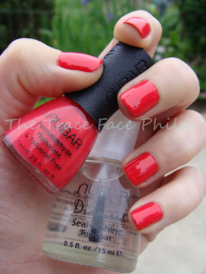 Nubar also sent me their Diamont Seal and Shine Topcoat. I used it over Costa Rica Coral. It is a thick top coat, which also applies smoothly. The smell is not too strong, and it works well. It definitely adds more shine to the Costa Rica Coral. When dry, this feels very soft and smooth to the touch. Super shiny, it almost looks "wet". I will be using it from now on with my Nubar polishes.