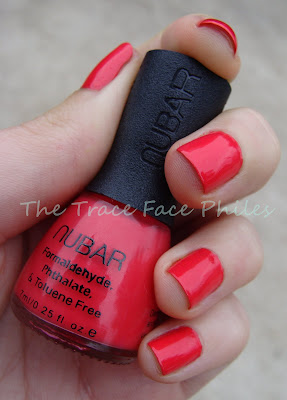 Nubar was nice enough to send me some products to review, and this is one of the colors I received. It is actually one of their new MINI bottles, which are 0.25 fl oz. Nubar's website describes Costa Rica Coral as "a bright tangerine colored warm tone inspired by the Ricordia variety". I really do like this color. It is a bright, cherry coral shade that goes on smoothly and has some shine to it. I had no problems applying it, the brush was easy to use, even with the mini size. I did put on 3 coats though. I felt like 2 were a tad streaky, and I was right, it looked much better with 3. It dried relatively quickly even with the 3 coats.