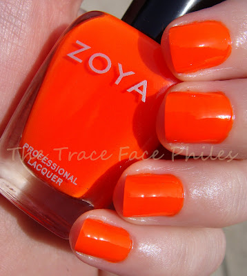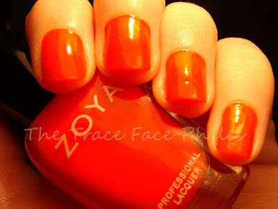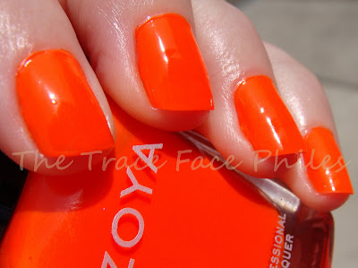 Zoya Paz is described as "Ultra-bright glowing neon traffic-cone orange creme. This outrageous shade is sure to stop traffic." I would have to agree! It is a bright orange color and will definitely get someones attention!